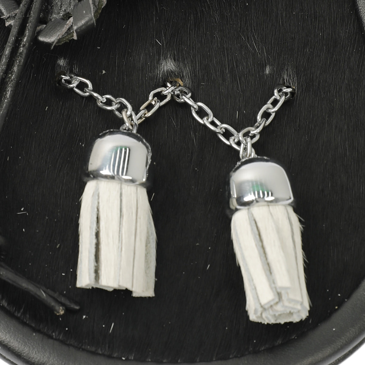 - White Leather Tassels: Two white leather tassels capped with polished silver and suspended from silver chains in a V-formation, creating a striking contrast.